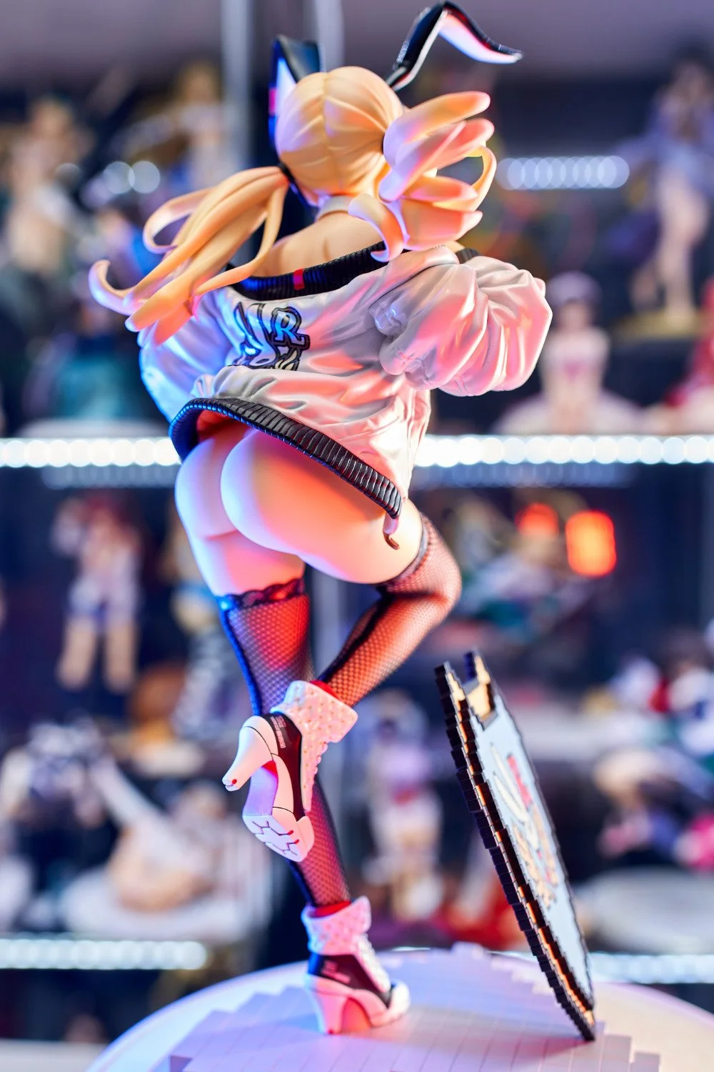 Because Mimi's hair isn't covering the back of her jacket, we also can see a bunny decal here, which is surprisingly detailed and has features a glossy sheen. I also like the inclusion of the red tag here and once again the word "PLAY!". As this wasn't present on the original illustration, the sculptor would have added this one on their own, which is a great attention to detail.